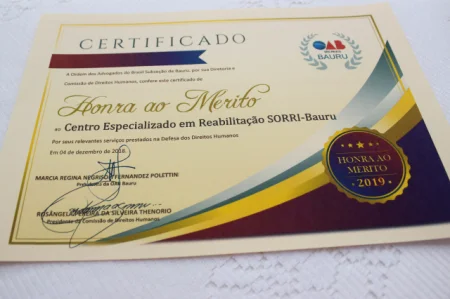 Na noite do último dia 10 de dezembro, a SORRI-BAURU foi homenageada pela Comissão de Direitos Humanos da OAB Bauru com o certificado de Honra ao Mérito por seus relevantes serviços prestados na defesa dos direitos humanos — por indicação do advogado Eduardo Borgo. O evento aconteceu no auditório da Casa da Advocacia de Bauru. O vice-presidente da SORRI-BAURU, Evandro Ventrilho, recebeu o documento das mãos da presidente da OAB Bauru, Marcia Regina Polettini, e da presidente da Comissão de Direitos Humanos da entidade, Rosângela Thenorio. Diretoria, conselheiros e funcionários da Instituição estiveram presentes.
